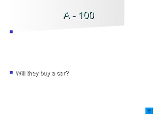 This document contains a series of questions in a Jeopardy-style format covering topics around verb conjugations and sentence structures. Each question provides answer choices for filling in the blank of a sentence with the correct verb conjugation. The questions range from 100 to 500 points and cover topics like making questions, negatives, future tense, and more. The final question combines multiple verb conjugations into a paragraph describing a busy upcoming week.