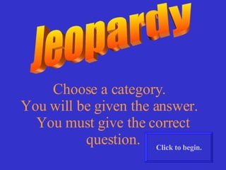 This document appears to be the text from a Jeopardy game, listing various categories, clues, and questions. It includes categories such as movies, mythology, Emery County, and Mountain Dew, as well as clues about Zeus, Ares, Cerberus, slot canyons in Emery County, glow in the dark rocks in a museum, movies like Titanic and Finding Nemo, Mountain Dew flavors and ownership, and animal classifications.