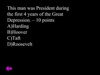 This document is a Jeopardy-style game about the Great Depression. It contains questions about: