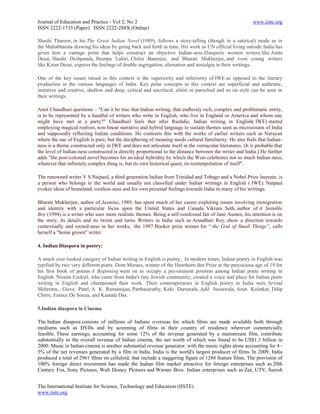 The document explores the concept of diaspora, particularly focusing on Indian writers who contribute to English literature, citing influential figures such as Salman Rushdie and Arundhati Roy. It discusses the evolution of Indian English literature, the intersection of identity and migration, and the cultural impact of the Indian diaspora in poetry, cinema, and music. Additionally, it highlights the global presence and commercial success of Indian cinema as well as the cultural blending in music influenced by the Indian diaspora.