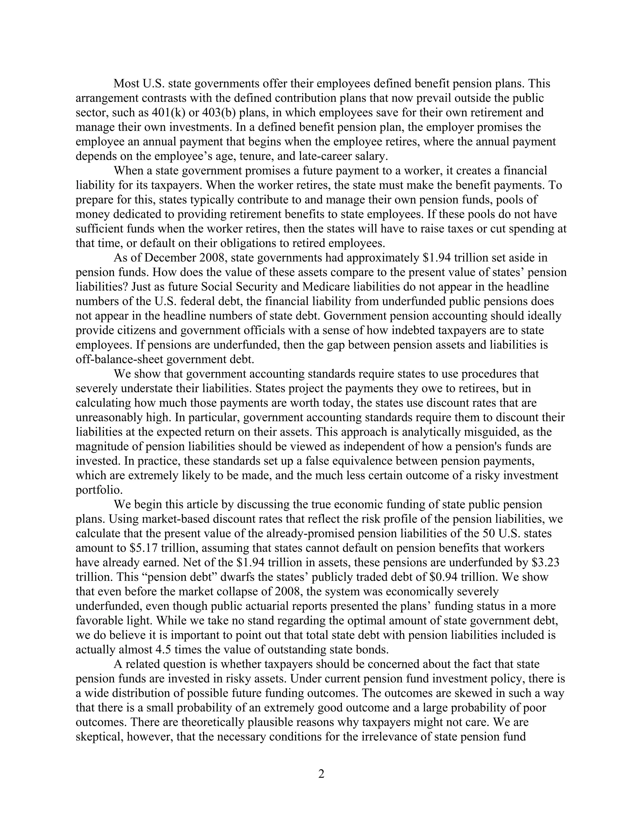 This document discusses the true funding status of public pension plans in the United States. It finds that while states have reported $1.94 trillion in pension assets, the actual liabilities using appropriate market-based discount rates are $5.17 trillion, resulting in an underfunding of $3.23 trillion. This underfunding is much larger than reported by states and represents a significant hidden debt burden on taxpayers. The document argues states should use risk-free discount rates like Treasury rates instead of the typical 8% rate when calculating pension liabilities, as pension obligations are very low risk from the state's perspective.