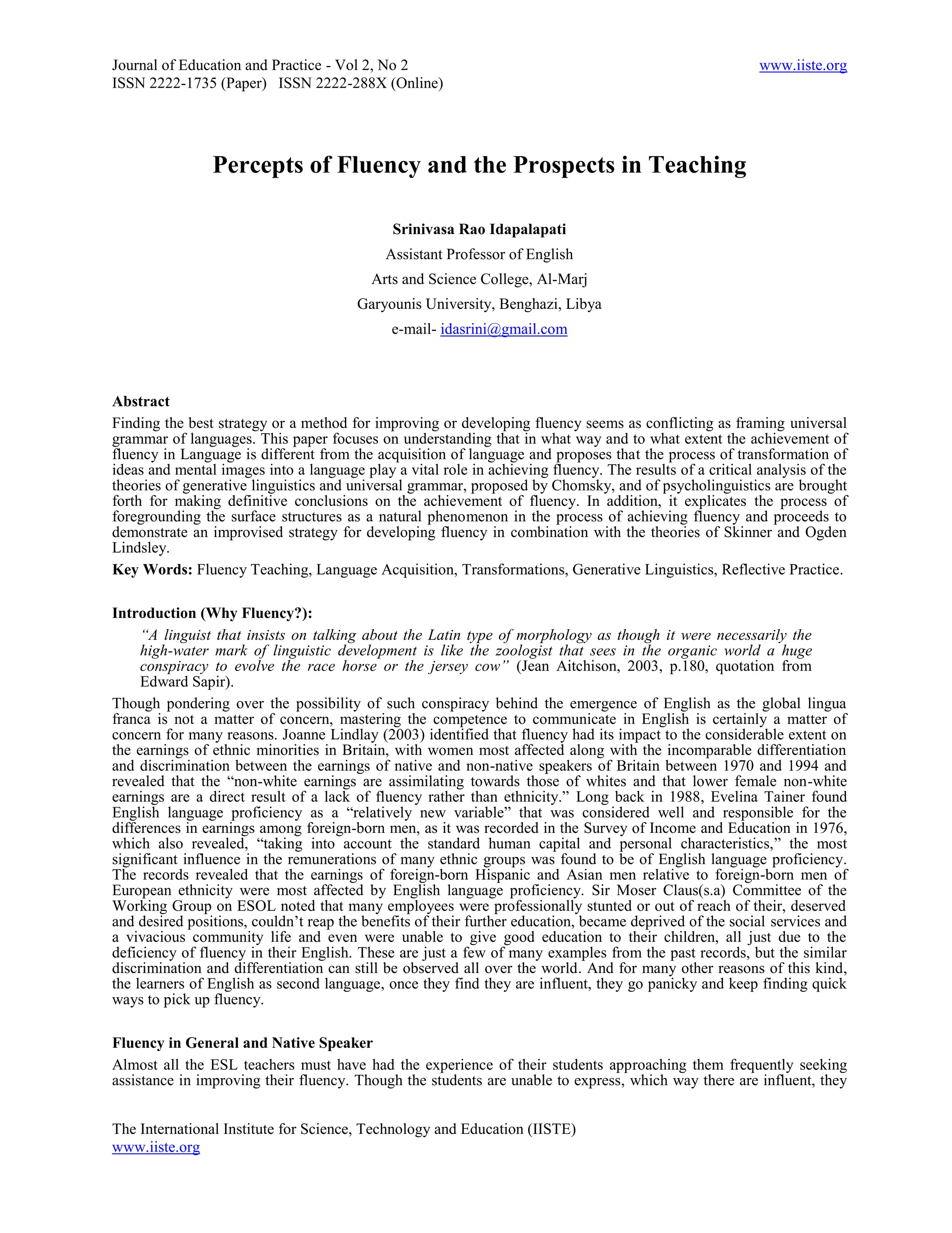This paper examines the distinction between language fluency and language acquisition and emphasizes the importance of transforming ideas into language to achieve fluency. It critiques existing theories while proposing strategies for improving English fluency, particularly for non-native speakers, highlighting the social and economic implications of fluency. The article underscores the complexity of acquiring fluency and calls for refined teaching methods to enhance learners' abilities.