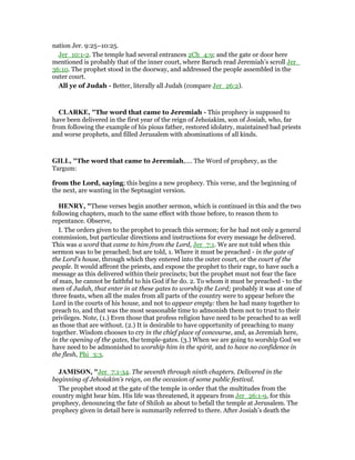 Jeremiah 7 presents a prophetic sermon delivered at the temple gate during Jehoiakim's reign, warning the people of Judah about their false confidence in the temple's security amidst their moral decay. The sermon condemns the people's hypocrisy, urging them to amend their ways and not to trust in the physical sanctuary of the temple, which could face destruction like Shiloh due to their wickedness. Ultimately, Jeremiah's message emphasizes repentance as the only hope for averting impending judgment on the nation.