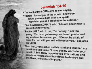 God calls Jeremiah to be a prophet and warns him that it will be a difficult task, as he must deliver messages of coming judgment. God knew Jeremiah and had plans for him even before he was born, setting him apart for a special purpose as a prophet to the nations. The key message is that just as God had purpose for Jeremiah's life, each person also has importance to God and a duty to fear Him and follow His commandments.