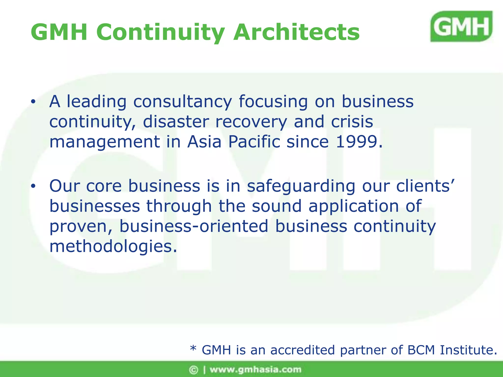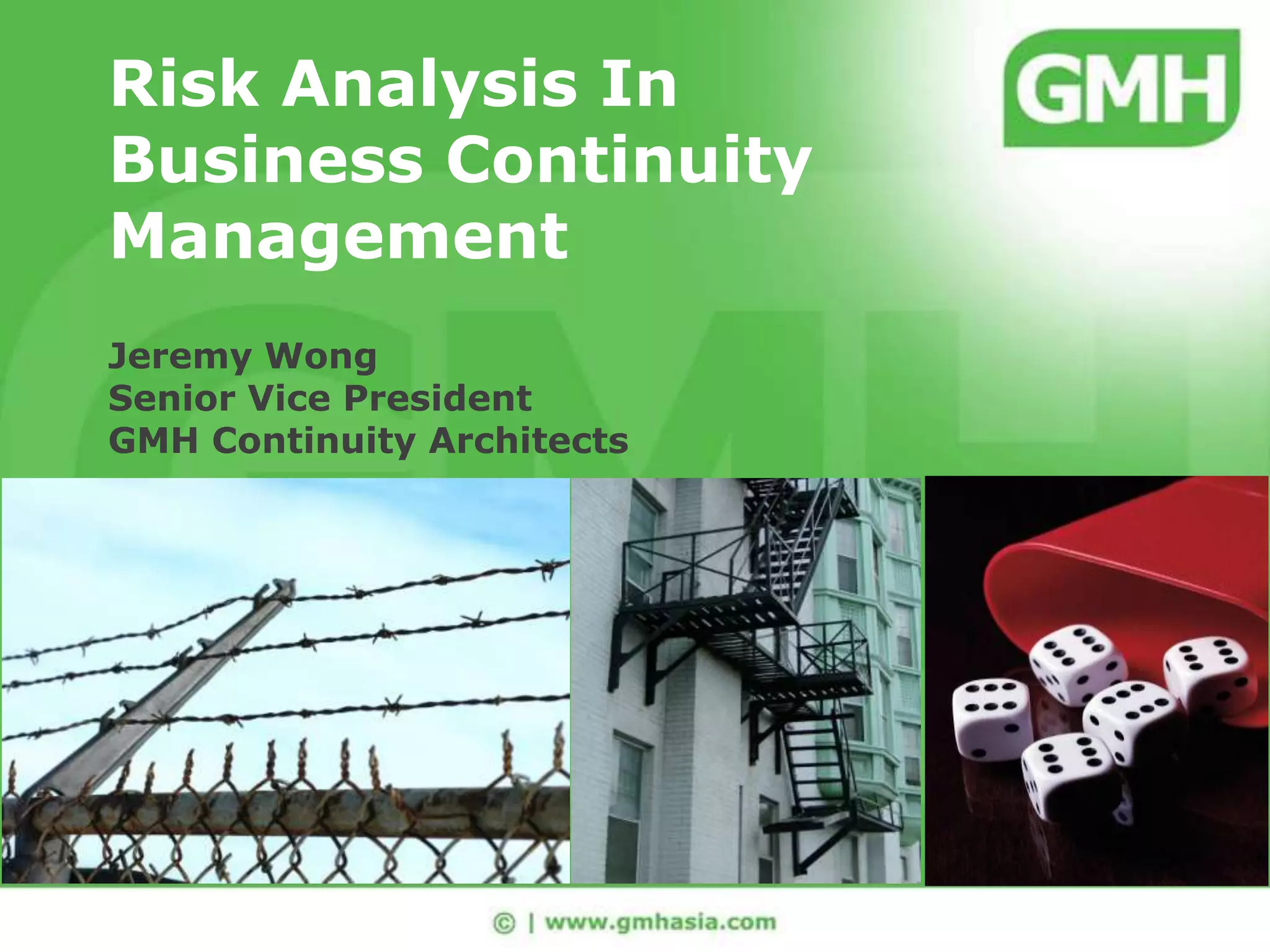 This document discusses risk analysis and business continuity planning. It explains that risk analysis involves identifying organizational assets, threats, analyzing risks, and evaluating risk levels. Key threats include natural disasters, accidents, and IT/infrastructure failures. The risk analysis process determines impact, likelihood, and risk levels to prioritize risks. It then explores risk treatment strategies like avoidance, reduction, transfer, and acceptance. Business continuity planning is one strategy to reduce risks that could interrupt operations. The overall process involves implementing recommendations, monitoring results, and making adjustments.