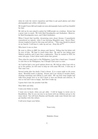 Ernar Makishev writes a letter to Belle and John, the children of his deceased friend and former roommate Jerome Labra. Ernar describes meeting Jerome 20 years ago when they were assigned as roommates in graduate school in the US. They became close friends and Ernar was Jerome's best man at his wedding. Ernar shares fond memories of their friendship and Jerome's passions for music and photography. Ernar expresses how much he still misses Jerome and hopes to stay connected with Belle and John in the future.