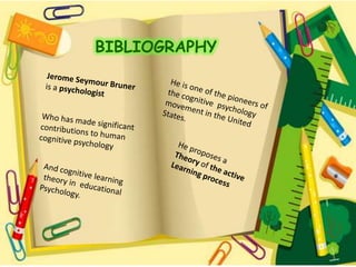 This document summarizes Jerome Bruner's theory of cognitive development. It discusses his three modes of representation - enactive, iconic, and symbolic. Bruner believed that learning involves relating new experiences to prior knowledge and that interest is a better motivator than competition. He also emphasized the importance of language and social learning, proposing that learners construct their own understanding with guidance from adults. The document compares Bruner's views to those of Vygotsky and Piaget on child development and education.