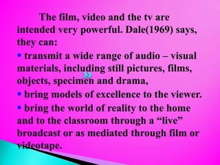 The document discusses the power of film, video, and television in the classroom. It notes that they can transmit a wide range of audiovisual materials, bring models of excellence and the real world into the classroom, make world events understandable, and provide unique perspectives. However, it also acknowledges limitations, such as encouraging passivity, small screen sizes, reducing creativity and imagination with excessive viewing, and exposing children to violence. The document concludes by outlining basic procedures for using TV as a classroom supplement, including preparing the classroom, pre-viewing activities, viewing, and post-viewing activities.