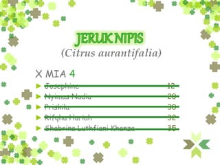 Dokumen ini membahas tentang jeruk nipis (Citrus aurantifolia), termasuk klasifikasi, ciri-ciri, cara menanam, pemeliharaan, dan panen. Selain itu, dijelaskan juga tentang hama yang menyerang tanaman serta manfaat kesehatan dan kecantikan dari jeruk nipis. Produksi jeruk di Indonesia masih jauh di bawah negara subtropis.