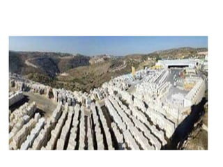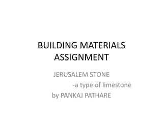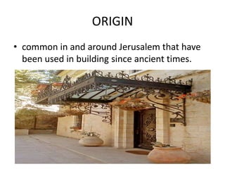 Jerusalem stone is a type of limestone that is common in and around Jerusalem and has been used in building construction since ancient times. It continues to be used today in buildings and Jewish ceremonial art. Chemically, Jerusalem stone is primarily composed of calcium carbonate with a specific gravity of 2.65 and water absorption between 0.8-1.5%. Physically, it ranges in color from white to pink to yellow and has long been used as an inexpensive local building material.