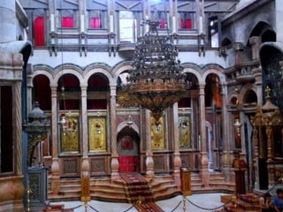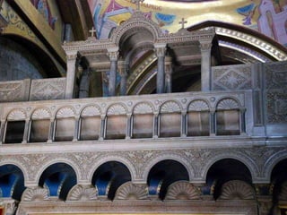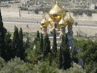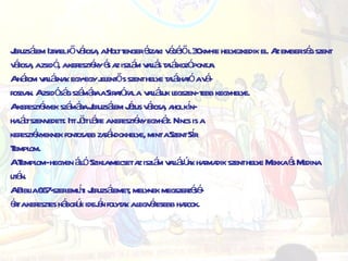 Jeruzslem 1. Zene : El Violinista JERUZSÁLEM 2. Jeruzsálem Izrael fővárosa, a Holt tenger északi végétől 30km-re helyezkedik el. Az emberiség szent városa, a zsidó, a keresztény és az iszlám vallás találkozópontja. A három vallásnak egy-egy jelentős szent helye található a vá- rosban. A zsidóság számára a Siratófal a vallásuk legszen- tebb kegyhelye. A keresztények számára Jeruzsálem Jézus városa, ahol kín- halált szenvedett. Itt jött létre a keresztény egyház. Nincs is a keresztényeknek fontosabb zarándokhelye, mint a Szent Sír Templom. A Templom- hegyen álló Szikla-mecset az iszlám vallásúak harmadik szent helye Mekka és Medina után. A Biblia 667-szer említi Jeruzsálemet, melynek megszerzésé- ért a keresztes háborúk idején folytak a legvéresebb harcok. 3. 4. 5. 6. 7. 8. 9. 10. 11. 12. 13. 14. 15. 16. 17. 18. A D á vid torony, a Jaffa-kapunál 19. 20. 21. 22. A S zent-Sír templom kupolája 23. 24. 25. A S zent Sír templom belső tere 26. 27. 28. 29. 30. 31. 32. 33. 34. 35. 36. 37. 38. 39. S zent An n a bazilika XI . sz. 40. 41. 42. 43. 44. 45. 46. 47.