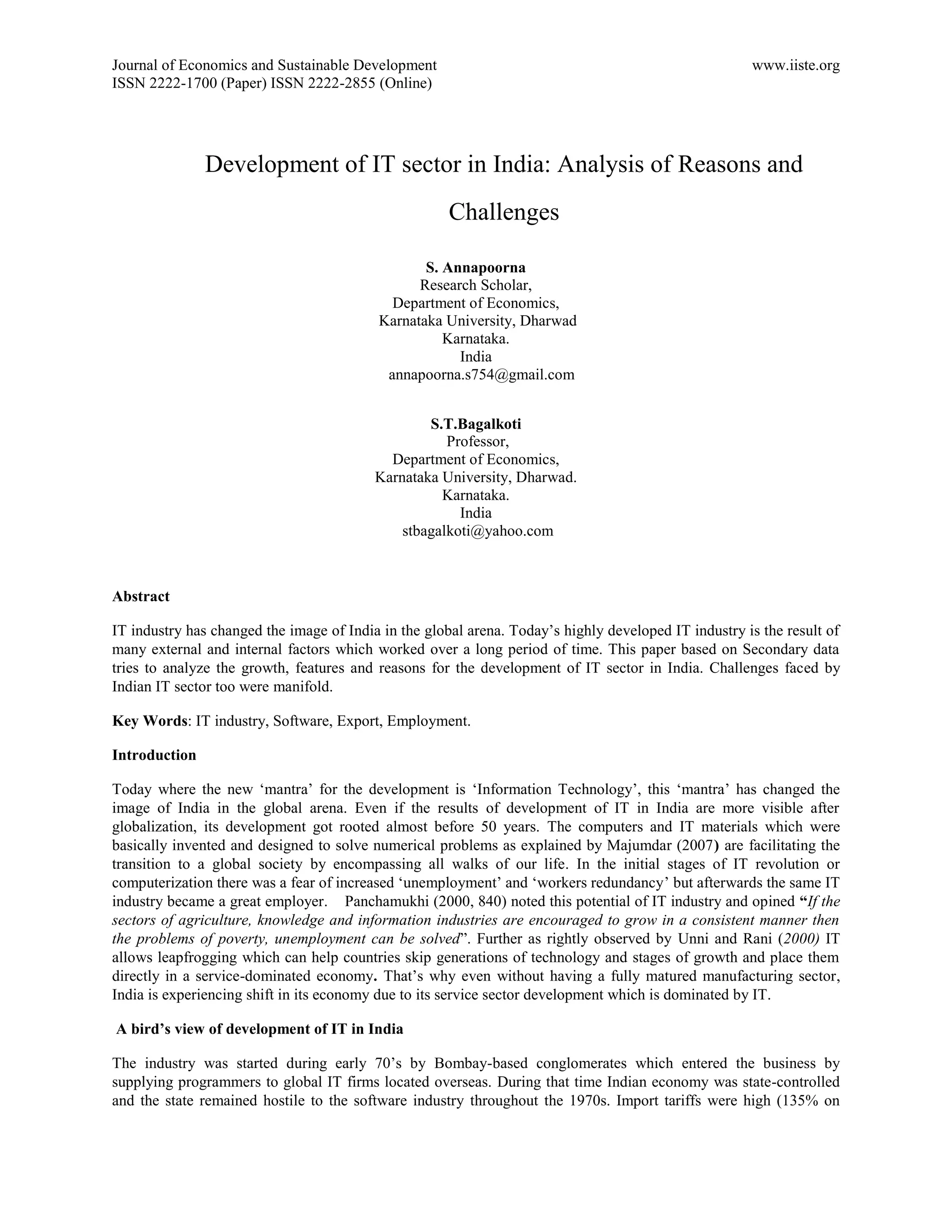 The document analyzes the development of India's IT sector, highlighting its significant growth influenced by both internal and external factors over several decades. Key elements include the industry's contribution to employment and exports, as well as challenges such as excessive export orientation and regional disparities in growth. It emphasizes the transformation of India into a global IT hub, driven by a skilled workforce and government policies, while also addressing issues like industry attrition and social inequalities.
