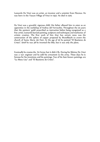 Leonardo Da Vinci was an artist, inventor, and scientist from Florence, Italy who lived from 1452 to 1519. He apprenticed under Andrea del Verrocchio and learned painting, sculpture, and techniques of artistic creation. Some of Da Vinci's most famous works include the Mona Lisa painting and plans for inventions like a bicycle and flying machine, though he is best known today for his artistic works and his role as a scientist and inventor ahead of his time.