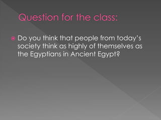 This document discusses several aspects of ancient Egyptian culture and art. It describes how makeup was used by Egyptians for vanity and sun protection. It also explains some of the symbolic meanings behind pharaonic images, coffins, and architectural features like pyramids. For example, it notes that Tutankhamen had three coffins and the most luxurious was made of gold and gems. Finally, it provides context about how rulers like Nefertiti and Ramses II used artistic depictions to portray themselves as powerful and great leaders.