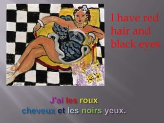 A person has blue hair and black eyes. Another has red hair and black eyes. The documents describe two people and their hair and eye colors in English and French.