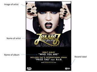 The document summarizes an advertisement for artist Jessie J's album. It analyzes various visual and technical codes used in the advertisement. The black clothing, makeup, hair, and nails suggest Jessie J is an urban artist with modern music. The color black connotes power, mystery, and sex, creating an edgy style. Jessie J's direct address and pose further sexualize the ad, targeting females aged 16+ and suggesting a message of female empowerment. Iconography like the gold writing of her name represents wealth and her desire to be seen as the "Queen" of her genre, while the black color represents mystery.