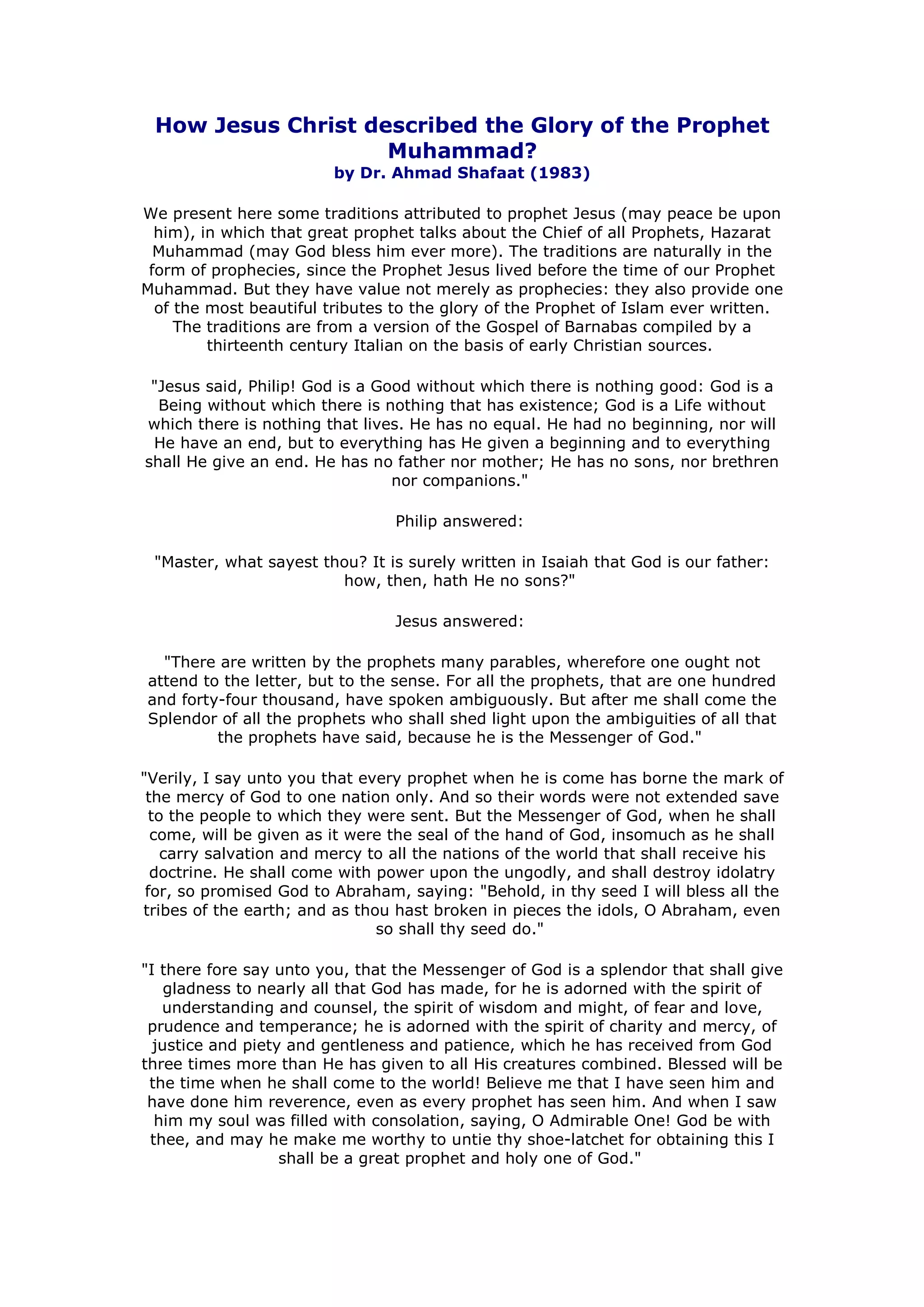 1) Jesus prophesied about the coming of Muhammad, describing him as the "Splendor of all the prophets" who would shed light on previous prophecies and bring salvation and mercy to all nations.