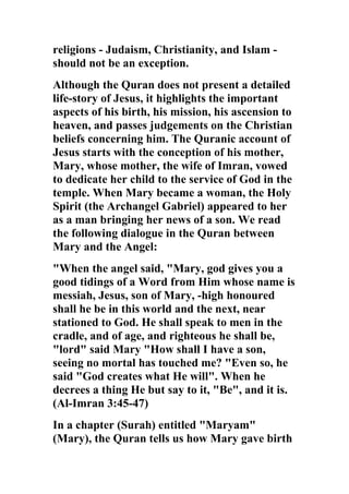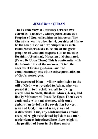 The Quran presents Jesus as a great prophet who was neither divine nor the son of God. It acknowledges his miraculous birth to Mary but emphasizes he was fully human. Jesus's mission was to spread God's message, confirm the Torah, and announce the coming of Muhammad. The Quran rejects the Christian concepts of Trinity and Jesus's crucifixion, stating he was raised alive to heaven and will return before the Day of Judgment. It portrays Jesus as a link in the chain of prophets beginning with Adam and culminating with Muhammad, who fulfilled Jesus's prophecy of a counselor to come.