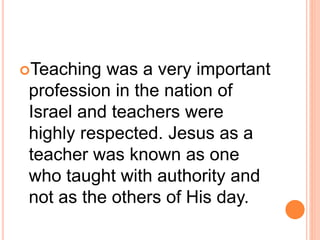 Jesus was a master teacher who taught with authority. He was recognized as a teacher and his followers were described as pupils. He was well-versed in scripture and understood human nature. Jesus used various teaching methods including questions, parables, lectures, assignments, and objects to effectively teach profound truths in a simple way. His goal was to convert pupils, bring harmony, form ideals, deepen convictions, and train disciples to spread his teachings.