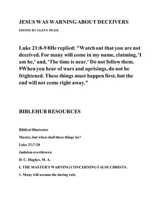 The document warns against false prophets and emphasizes the need for vigilance and faith amid turmoil, as indicated in Luke 21:8-9. It illustrates the inevitability of destruction and the need for Christians to prepare for suffering, while highlighting Christ's knowledge and ability to support His followers through trials. It concludes by discussing the importance of living a life aligned with truth and the eternal significance of one's actions in light of faith.