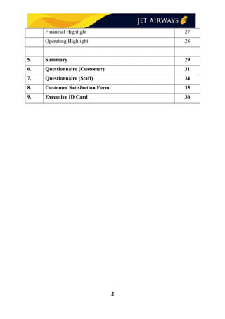 Jet Airways is an Indian airline headquartered in Mumbai. It operates domestic and international flights and has subsidiaries including Jet Konnect and Jet Lite. The document provides an overview of Jet Airways, including its history, subsidiaries, destinations served, mission, products and services offered. It also discusses Jet Airways' situation analysis covering internal environment, external environment, competitors, and the aviation market. The financial projections section outlines forecasts for metrics like revenue, profit, passenger load factor and cargo.