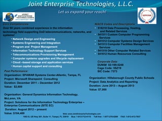 Joint Enterprise Technologies is an information technology services company with over 55 years of combined experience supporting Department of Defense organizations (DoD). It strives to provide efficient, technically sound, and fiscally responsible IT solutions to government agencies. The company is managed by Richie Harris and Charles Middleton and specializes in areas like network engineering, systems integration, and IT support services. It has provided services to organizations like SPAWAR Systems Center-Atlantic and Hillsborough County Public Schools.