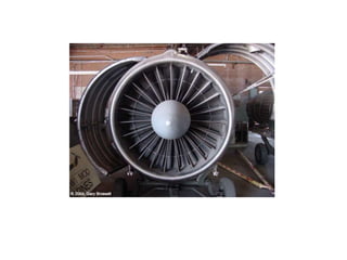 Jet engines work by compressing air, mixing it with fuel, igniting it to produce hot exhaust gases, and channeling the exhaust out of a nozzle. The major components are the air intake, compressors, combustors, turbines, and nozzle. The compressed air and fuel burn in the combustor, driving turbines which power the compressors and fan. The high-energy exhaust exits through the nozzle, producing thrust that propels the aircraft forward. Advanced jet engines also include components like turbo pumps, afterburners, and thrust reversers.