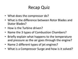 The document provides an overview of jet propulsion concepts, including the functions of various engine components like compressors and turbines. It explains the principles of airflow, combustion types, and the role of elements such as afterburners and reverse thrust for improved performance. Key topics include the differences between centrifugal and axial flow compressors, as well as the behavior of air pressure and temperature through the engine process.