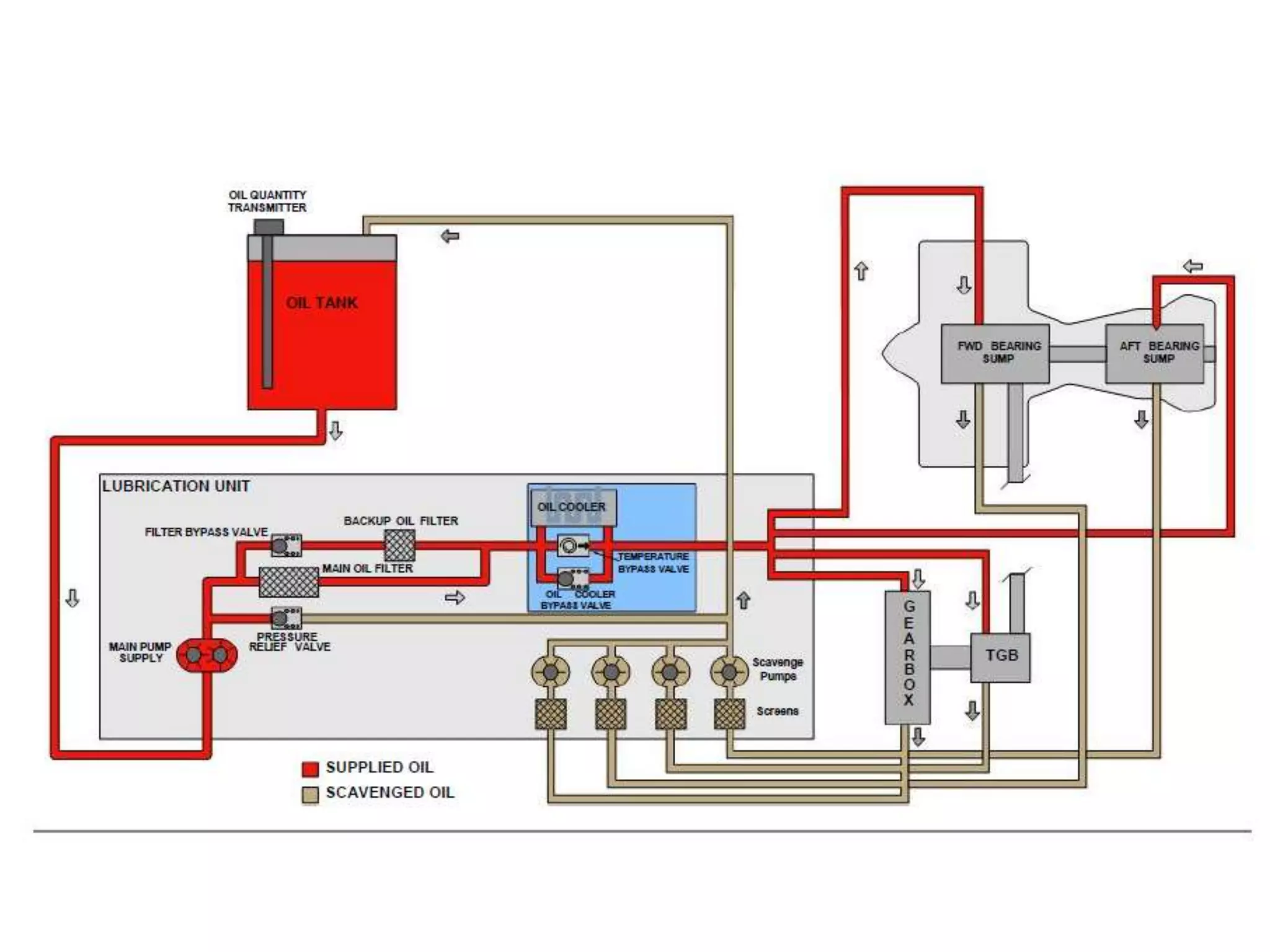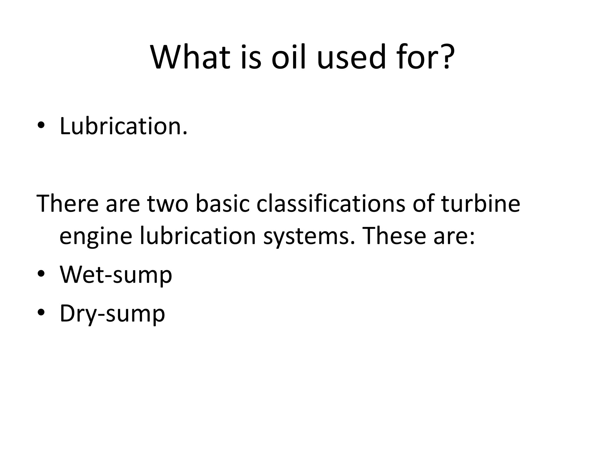 There are two main types of turbine engine lubrication systems: wet-sump and dry-sump. Wet-sump systems store and circulate oil within the engine housing, while dry-sump systems use external tanks and pumps to store, cool, and circulate oil. Dry-sump systems are now more common and can be categorized as either hot-tank or cold-tank depending on whether oil is cooled before or after returning to the external storage tank. Both systems pressurize oil to lubricate engine bearings and gears and use scavenger pumps to return drained oil for recirculation.
