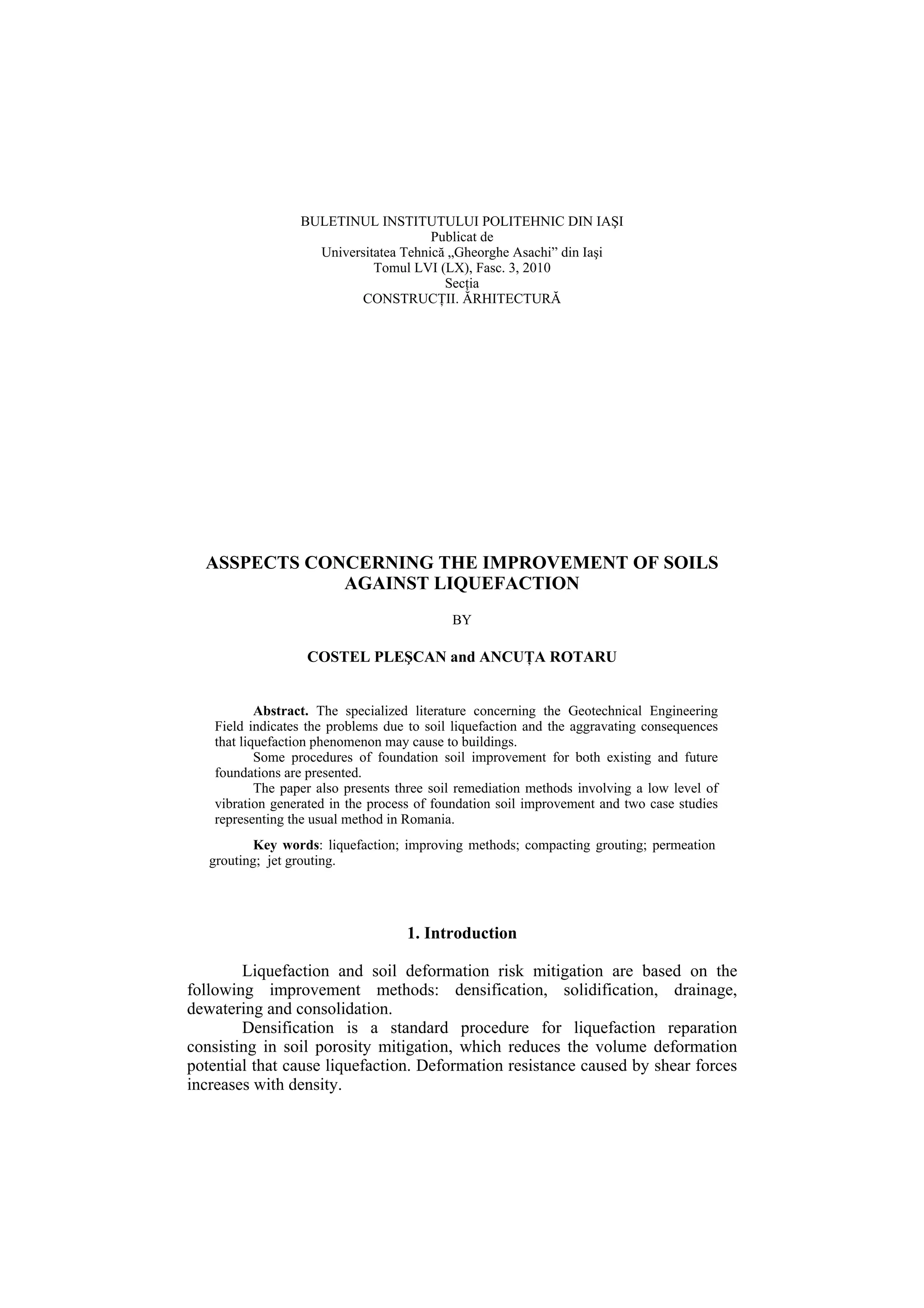 This document discusses methods for improving soils susceptible to liquefaction. It presents compaction grouting, permeation grouting, and jet grouting as methods that involve low levels of vibration. Compaction grouting involves injecting a cement mixture to densify the soil. Permeation grouting strengthens soils through cementation and fills pores to prevent water movement. Jet grouting forms cement-soil columns by injecting a high-pressure fluid mixture. The document also provides two case studies in Romania where jet grouting was used for underpinning and excavation support.