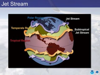 This document provides information about various meteorological concepts including the jet stream, surface winds, high and low pressure systems, and fronts. It defines the jet stream as the atmosphere's response to strong temperature gradients and density changes, occurring where wind speeds are at least 50 knots. It notes that the jet stream elevation is not fixed and can impart vertical motion. Fair weather typically occurs between ridges and troughs while inclement weather is found between troughs and ridges. Cold fronts involve cooler air replacing warm air and may produce thunderstorms, while warm fronts bring warmer air more gradually with clouds and rain ahead of the front.