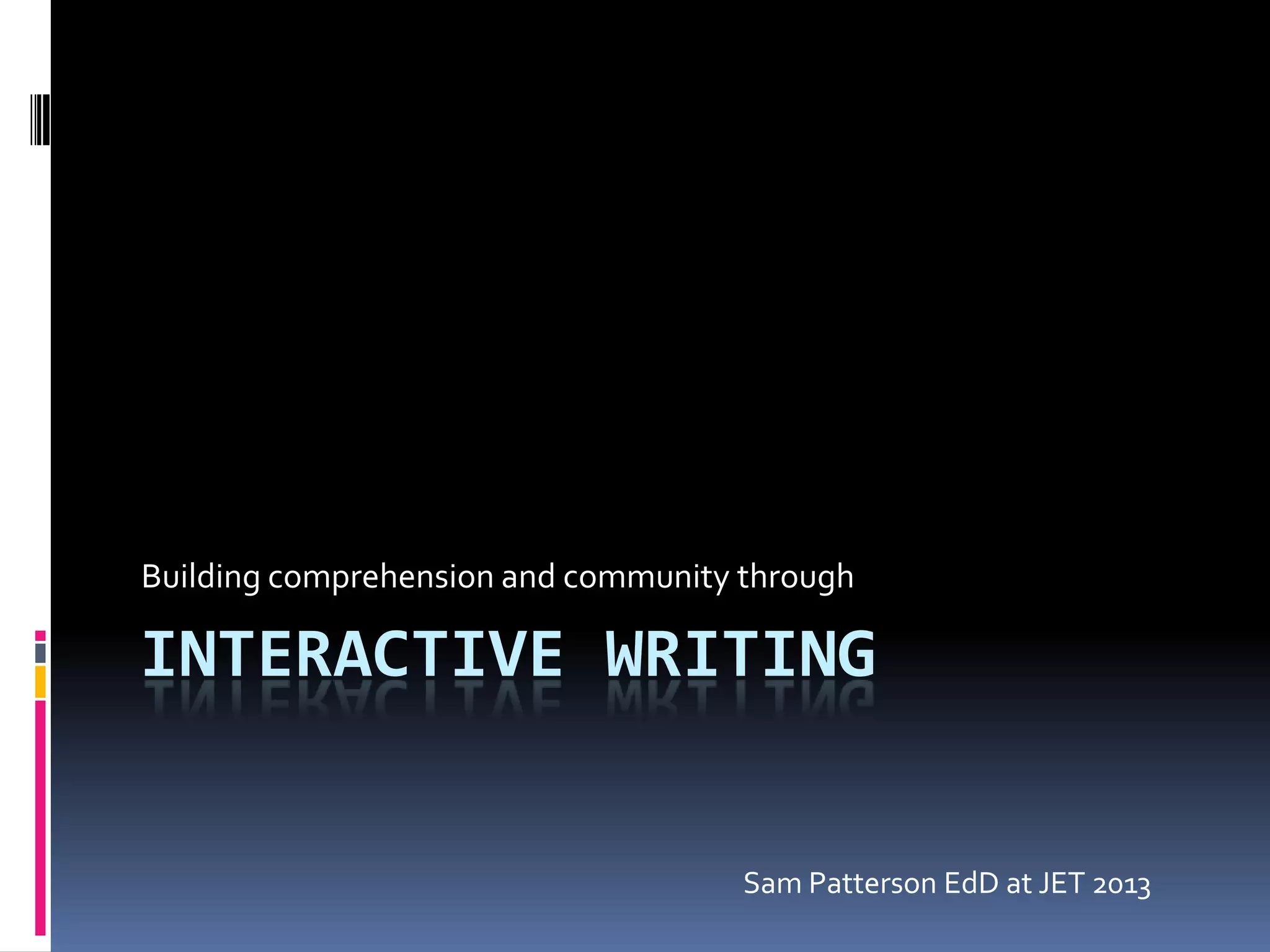 The document discusses interactive writing and its role in enhancing comprehension and community among students. It emphasizes the importance of modeling, reflection, and transparency in the writing process, while highlighting the functionalities and safety features of Kidblog as a platform for student engagement. Additionally, it notes the significance of building connections through comments and sharing within an educational community.
