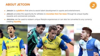 This document summarizes Jetcoin, a platform that aims to help athletes monetize their talents and fan bases. Jetcoin uses blockchain technology to connect athletes, teams, fans, brands, and investors. It allows athletes to issue digital tokens representing a percentage of future earnings, which can then be sold to fans and investors. This provides athletes with upfront capital while also giving fans a way to financially support athletes. The funds are used to implement athletes' career plans. Overall, Jetcoin creates a marketplace that allows all parties to benefit from an athlete's success.