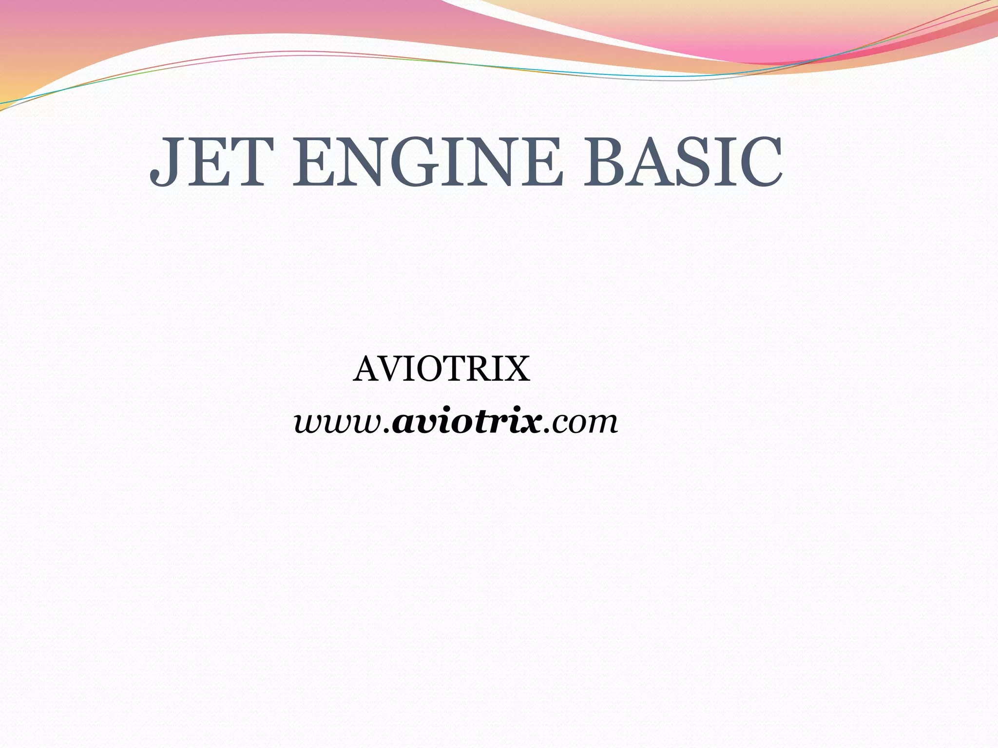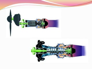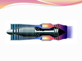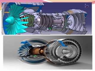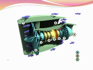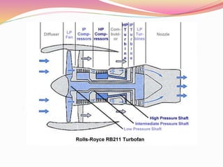 This document provides an overview of jet engine basics. It discusses the main types of jet engines including turbojet, turbofan, turboprop, and turboshaft. The turbofan engine is described as employing a bypass design that provides around 80% of total thrust from bypass airflows. The core components of a jet engine are also summarized, including the compressor, combustor, turbine, and their basic functions in the Brayton cycle that powers gas turbine engines.