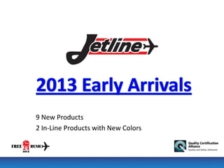 The document outlines nine new and two in-line products, including exercise bands, fitness bottles, tumblers, a bottle opener, USB car adapter, and stress relievers with various features and available colors. Each product includes details such as item size, imprint methods, shipping weights, and expected arrival dates. These promotional items are designed for fitness, hydration, and stress relief, aimed at various market segments.