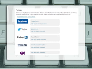 Jetpack is a plugin that provides additional features for self-hosted WordPress sites like social sharing, stats, and comments. It requires a WordPress.com account and connection. Some key features include Publicize for automatic cross-posting, Sharing for social media icons, Jetpack Comments, Subscriptions to follow a site, and WordPress.com Stats for analytics. It also includes extra widgets, contact forms, and a carousel. Installation involves downloading the plugin and connecting to a WordPress.com account.