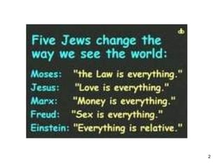 This document provides an overview of Jewish humor through history. It discusses how Jews have constituted a large percentage of comedians despite being a small percentage of the population. Some key aspects of Jewish humor discussed include use of self-deprecation, rapid-fire joke telling reflective of New York culture, and examining issues from multiple angles through "pilpul" learning. Many famous Jewish comedians are profiled such as the Marx Brothers, Woody Allen, Jerry Seinfeld, and others. Links to video clips of their acts are also provided.