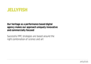 Jellyfish is a 10+ year old digital performance marketing agency with over 80 employees. They have developed proprietary technology like their JUMP PPC management platform to manage complex campaigns across many markets and languages. They take a structured approach to campaign management focused on KPIs and ROI. This includes keyword structuring, attribution modelling, and forecasting. They also provide SEO services like technical audits, link building, and content optimization. Reporting is frequent and covers both performance metrics and strategic recommendations.