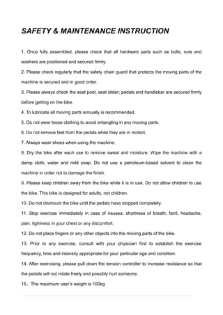 The spinning bike owner's manual provides essential safety, maintenance, and assembly instructions for the bike, emphasizing the importance of securing all parts, using proper clothing, and consulting a physician before exercising. It outlines steps for assembly, usage tips, and warm-up, exercise, and cool-down phases to enhance fitness and minimize injury. Key safety reminders include keeping children away from the bike, checking moving parts, and stopping exercise if experiencing discomfort.