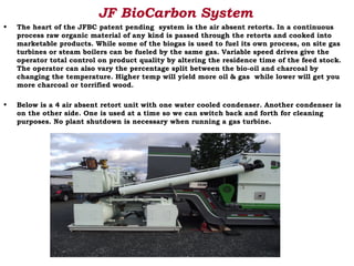 JF Biocarbon Systems has developed an innovative waste-to-energy technology based on continuous process pyrolysis, which can efficiently convert various organic materials into charcoal, bio-oil, and biogas at a scale of up to 200 tons per day. This self-sustaining system is designed for commercial application, offering a low-cost and environmentally responsible solution to energy demands while addressing organic waste issues in both developed and developing economies. The technology emphasizes simplicity, flexibility in operation, and compliance with strict global emissions standards, promoting sustainable energy solutions and fostering economic opportunities.