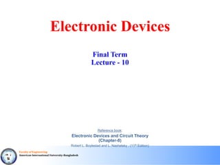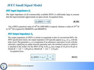 This document is from the Faculty of Engineering at American International University-Bangladesh and contains lecture notes on electronic devices and circuit theory. It discusses the JFET small signal model and AC equivalent circuit, provides an example of a fixed-bias configuration, and marks the end of Lecture 10 on the topic.