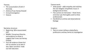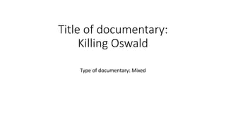 The documentary "Killing Oswald" examines the assassination of President John F. Kennedy and the evidence surrounding Lee Harvey Oswald. It begins by questioning who killed JFK, then presents conspiracy theories and evidence that Oswald committed the assassination. Through interviews with professionals and archival footage and recordings, the documentary builds the case against Oswald but ultimately leaves the conclusion open as the true circumstances remain unclear.