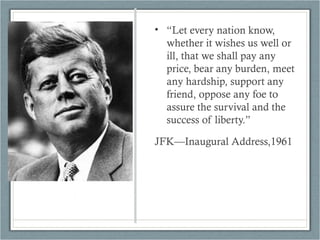 The document summarizes key events in US foreign policy during the early 1960s under presidents Kennedy and Johnson. It describes the failed Bay of Pigs invasion, the Berlin Crisis and Kennedy's confrontation with Khrushchev over Soviet missiles in Cuba, known as the Cuban Missile Crisis. It also discusses Kennedy's Alliance for Progress initiative to promote economic development in Latin America and the establishment of the Peace Corps. The summary concludes by noting Johnson's continuation of containment policies against communism, including sending troops to the Dominican Republic and military advisors to South Vietnam.