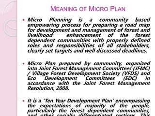 This document discusses micro planning, which involves community-based forest management planning. It defines micro planning as a process for developing a 10-year plan for forest management and livelihood development with local stakeholders. The key points are: