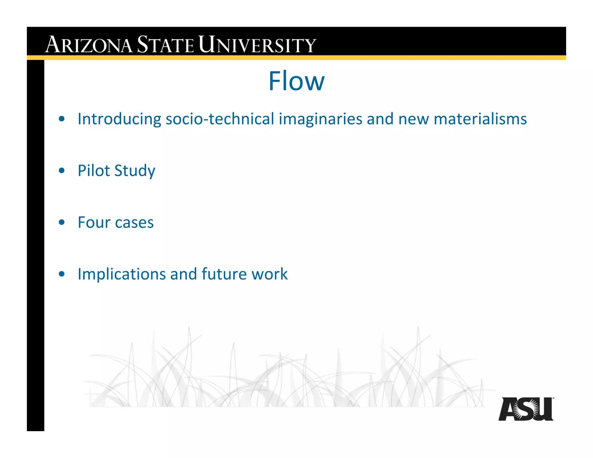 This document summarizes a pilot study conducted with an electric utility in Arizona to understand how they market renewable energy programs to the public. The study analyzed cultural artifacts like websites, newsletters and billboards to understand the messaging and its delivery. Interviews with utility employees provided insight into the representation process and their visions. The study aims to understand how collective understandings influence policy feedback loops and examines the links between utilities, policymaking and publics. Future work is focused on similar analysis of community renewable projects in Italy.