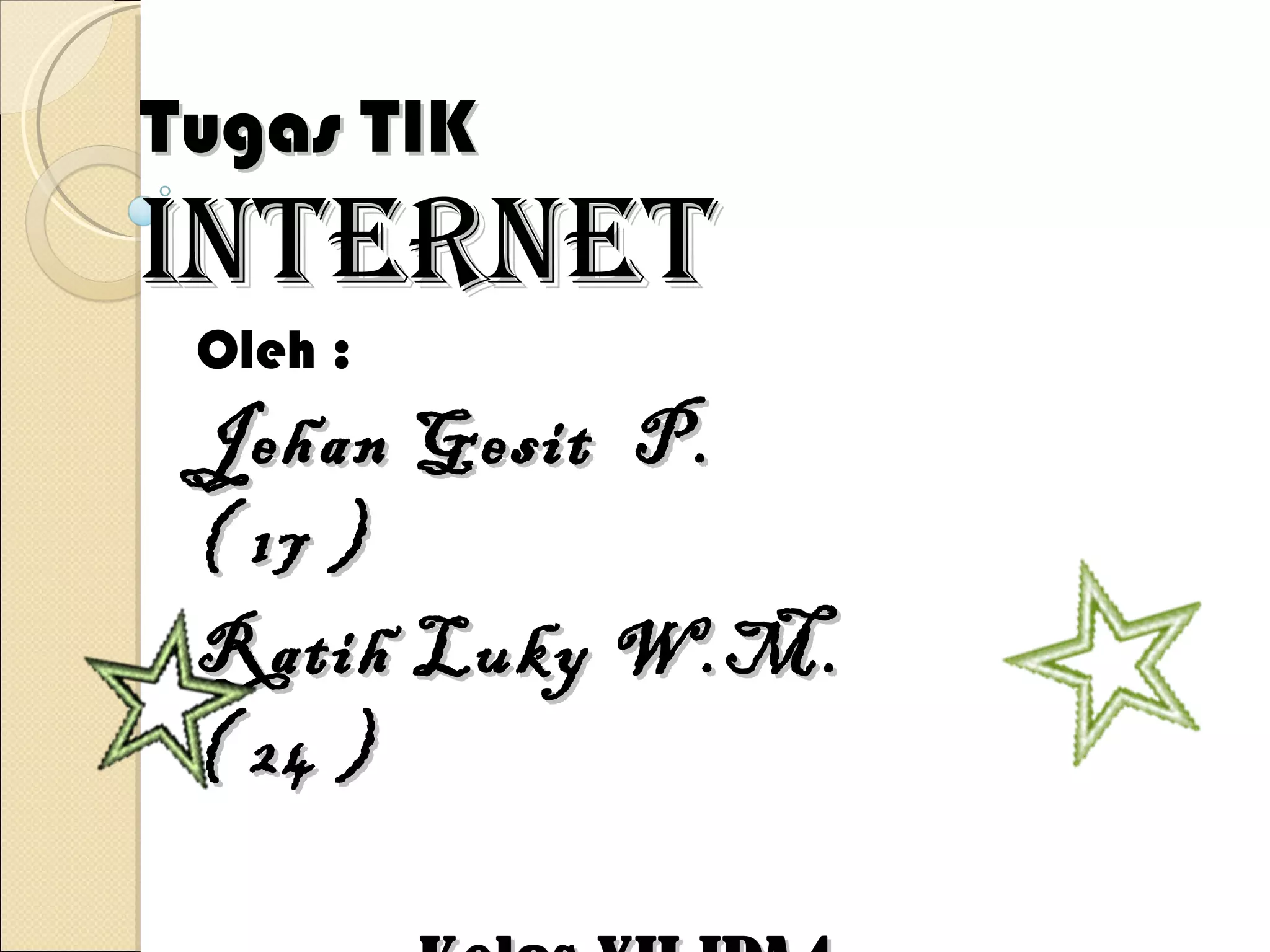 Dokumen tersebut membahas tentang Internet, mulai dari pengertian, sejarah, manfaat, istilah-istilah, dan hardware yang dibutuhkan untuk mengakses internet. Internet dijelaskan sebagai sistem jaringan komputer global yang saling terhubung menggunakan protokol TCP/IP, sementara manfaatnya meliputi akses informasi yang luas dan kolaborasi antar pengguna tanpa batas ruang dan waktu.