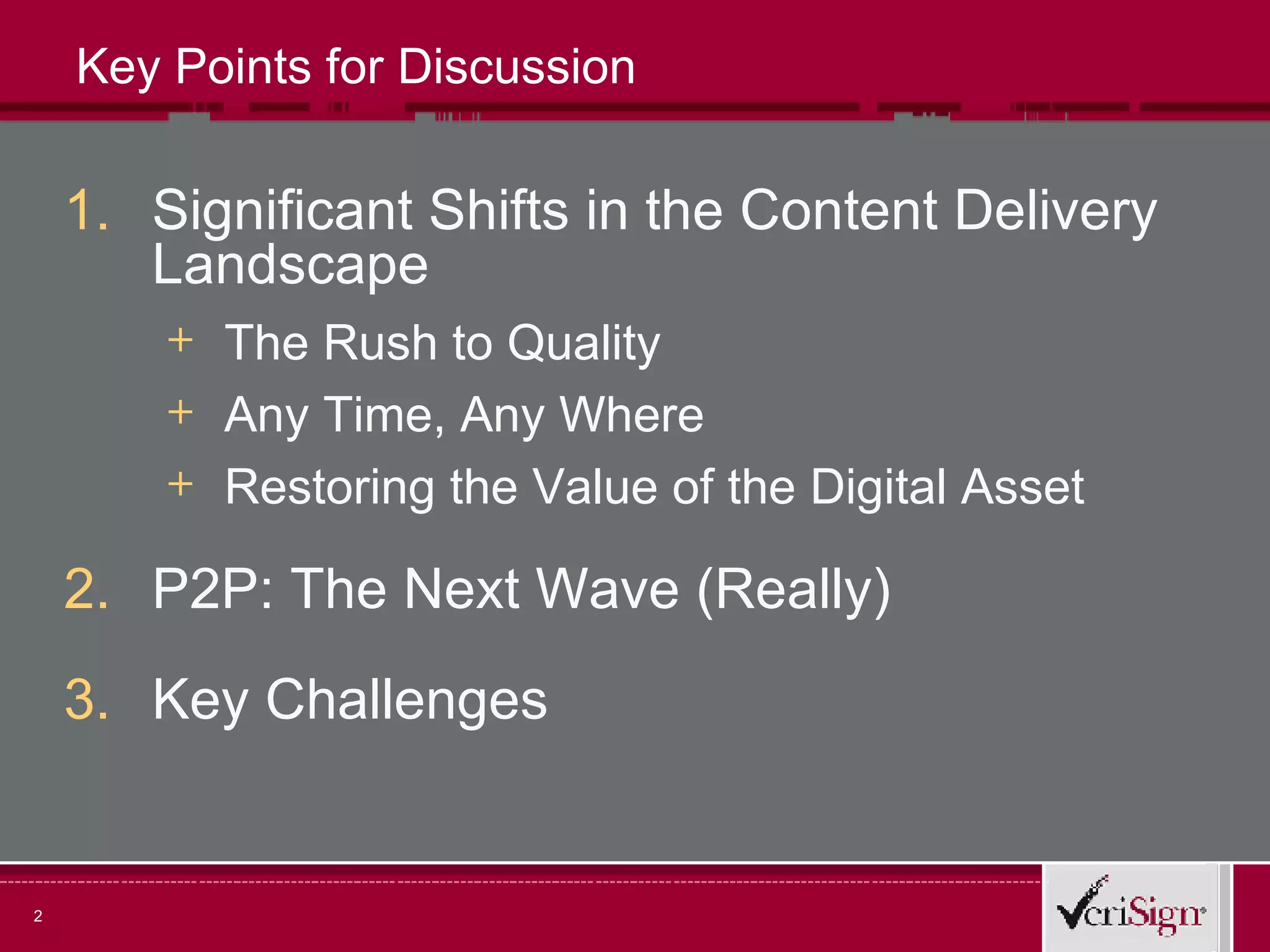 The document discusses recent shifts in content delivery including a move towards higher quality streaming options available anytime on different devices. It also discusses restoring the value of digital assets through limiting piracy with peer-to-peer content delivery networks. Finally, it addresses some of the challenges in peer-to-peer delivery including public perception, business models, and traffic management.