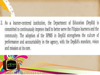 The Results-based Performance Management System (RPMS) of DepED supports the agency's vision, mission, and values by continuously evolving as a learner-centered public institution. The RPMS helps ensure the strategic, responsive, and effective delivery of human resource management and development services to implement a learner-centered and school-based management system. The guidelines provide for the establishment and implementation of RPMS in all DepEd schools and offices, covering officials and employees, and stipulate the mechanisms, criteria, and processes for performance target setting, monitoring, evaluation, and development planning.