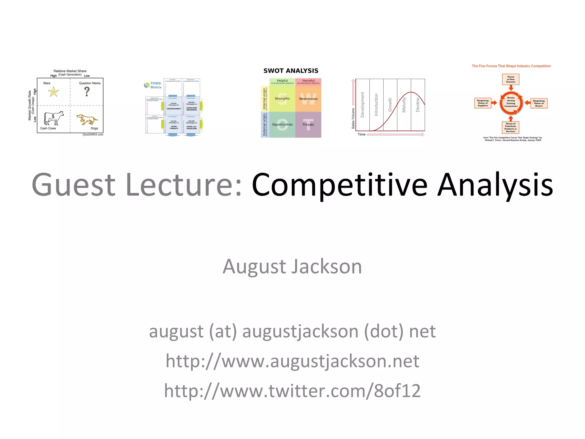 The guest lecture by August Jackson focuses on competitive analysis using various analytical frameworks including SWOT/TOWS, industry analysis (Porter's Five Forces, STEEP, PEST), and market trend analysis via Gartner and disruption models. It emphasizes the importance of evaluating factors such as accuracy, resource efficiency, and stakeholder analysis to inform decision-making. Additionally, the presentation covers current trends in the beverage industry and the impact of economic and social factors on consumer behavior.