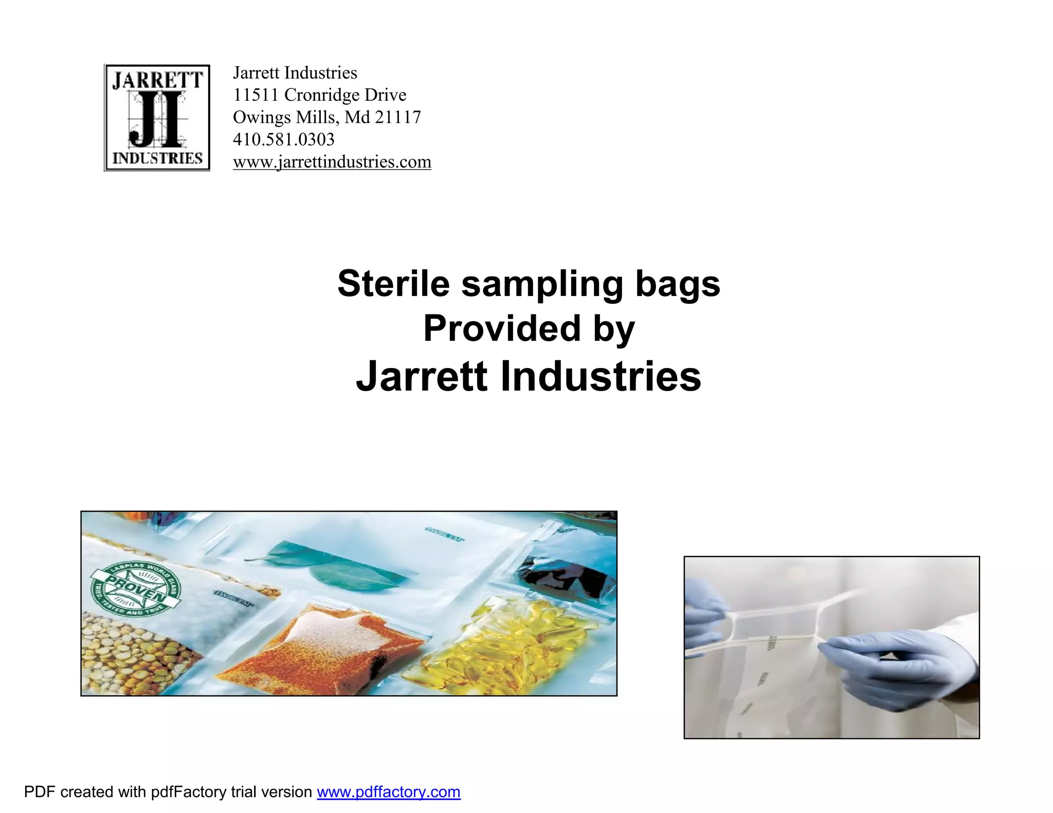 Jarrett Industries produces over 40 million sterile sampling bags per year in their clean room facility in Owings Mills, Maryland. They offer a variety of stock and custom bag sizes and materials for sampling in industries like food production, research laboratories, environmental testing, clean rooms, medical, and veterinary uses. Jarrett Industries works directly with customers to provide reliable and consistent sampling bag solutions.